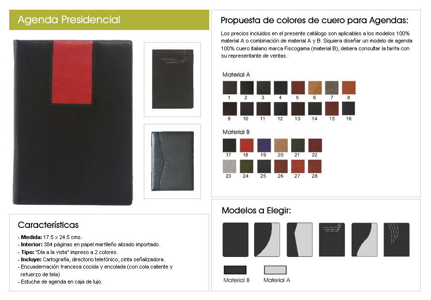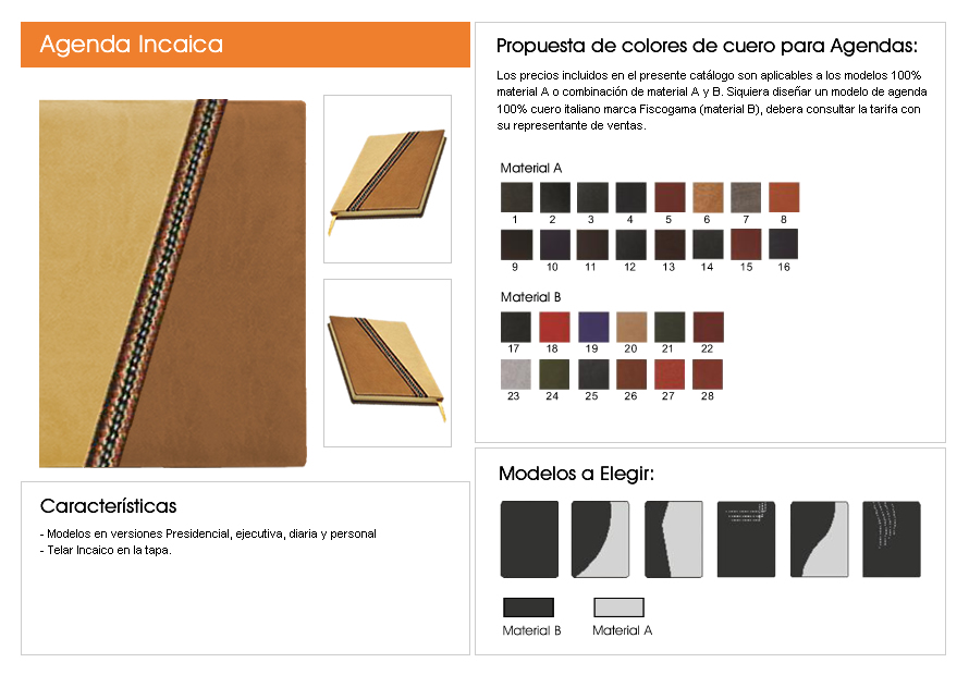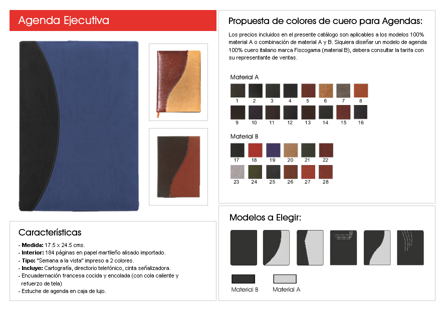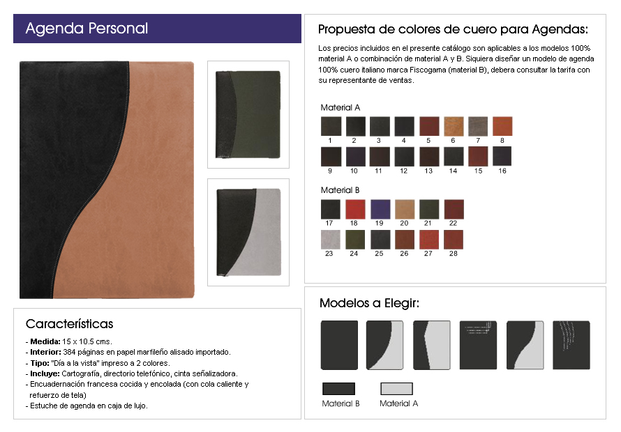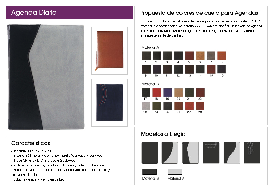 En la línea de Agendas, nuestra colección aprovecha la textura y color del cuero italiano para desarrollar modelos de cortes lineales y borleados los que se adaptan perfectamente a los demás colores de la gama de cuero importado. Todo ello con la finalidad de desarrollar un producto exclusivo para su Empresa. |